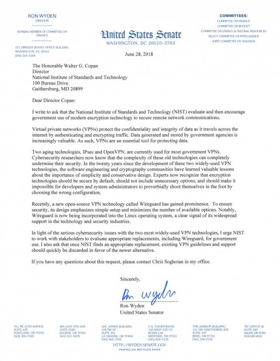 图3 美国俄勒冈州参议员向NIST推荐WireGuard VPN