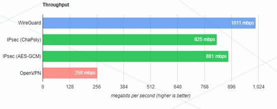 WireGuard VPN直接在内核层面处理路由,直接使用系统内核的加密模块来加密数据,省去了用户进程和内核交互的开销,因此性能优越,具体表现为吞吐量高,是SSLVPN/OpenVPN的2~4倍,见图1所示,同时,时延低,是SSLVPN/OpenVPN的30%~40%,见图2所示。