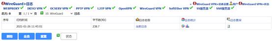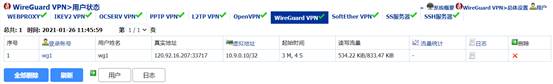 提供内核级及用户态两种运行方式,设置WireGuard VPN监听端口、启用停用SNAT、虚拟IP地址池、目的IP地址池、源IP控制、时间控制、流量控制、服务器公钥私钥、客户端DNS服务器等,自动生成Iptables网络防火墙规则,定期检查、修复WireGuard VPN状态(Watchdog),根据公网IP、服务器公钥更新已有客户端配置文件,管理界面见下图4所示。