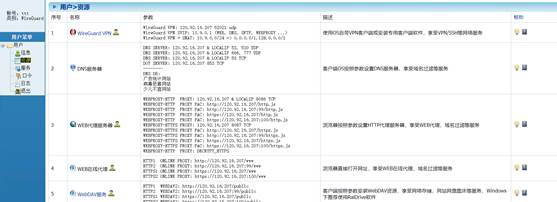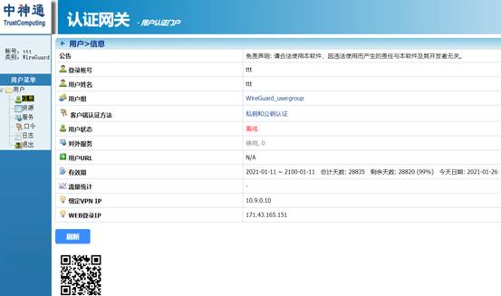 为终端用户提供自服务WEB用户门户,用户登录后强制修改密码,下载WireGuard VPN客户端配置文件、扫描配置文件的二维码,修改、更新、销毁WireGuard VPN公钥私钥,查看账号状态、有效期,查看可用资源,查看对外服务项目,查看公告等。有了自服务WEB用户门户,成百上千用户WireGuard VPN密钥的分发、修改、销毁不再是管理负担,用户门户界面见下图8所示。